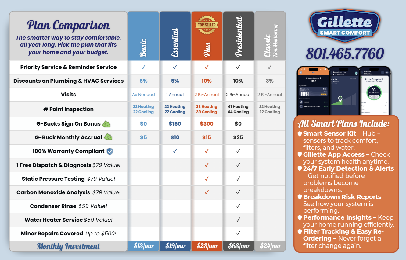 Gillette Heating and Air has long been committed to providing top-tier heating, cooling, and indoor air quality services. Our Smart Care Advantage Plan has been redesigned to ensure your HVAC systems operate efficiently year-round, offering benefits such as remote monitoring, regular system check-ups, priority service, and discounts on repairs.